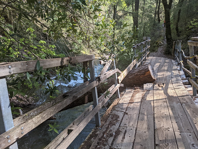 At the first significant bridge, which goes over the North Fork of the American River at mile 3.24, the entire center, from edge to edge, was a giant muddy puddle. 6 or 7 runners in front of me got onto a narrow curb and were shuffling sideways to avoid getting wet. I just leaped in and ran down the middle. It was fine!